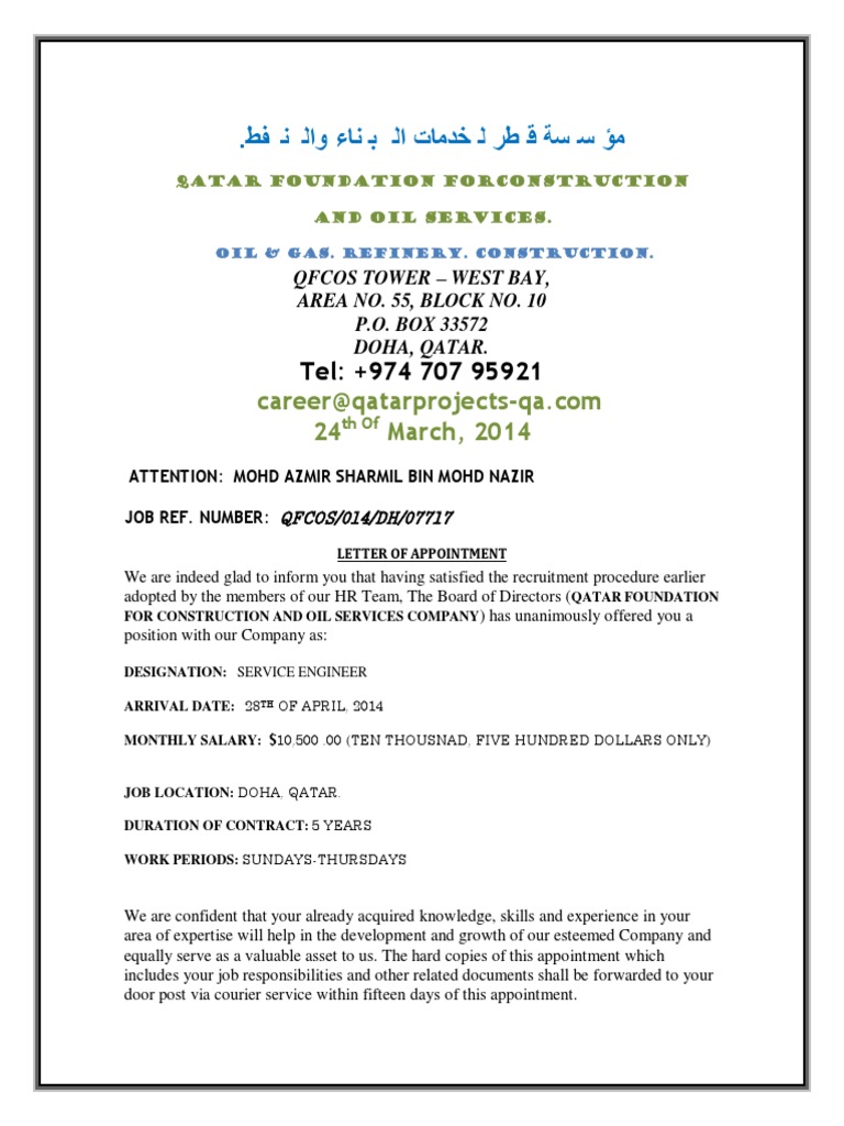 The team and i cover overwhelmed with your background and advance and would be keen on to officially offer you a position as a (job title) at xyz company. Job offer letter sample qatar. It covers the most important employment terms: It is owned by the state of qatar. Job offer letter template company logomm/dd/yyyy. On the other hand, a verbal job offer is different where an employer would call the employee and would let them know that they offered a. company name is excited to call you our new job title. Offer letter from xyz company. Aktuelle top jobs im mittelstand finden. Compose each individual letter based on the reason for not accepting the position. Sample of a job offer letter: Sometimes you like the company but the offered position just isn't right for you. Mohd azmir sharmil bin mohd nazir job ref.